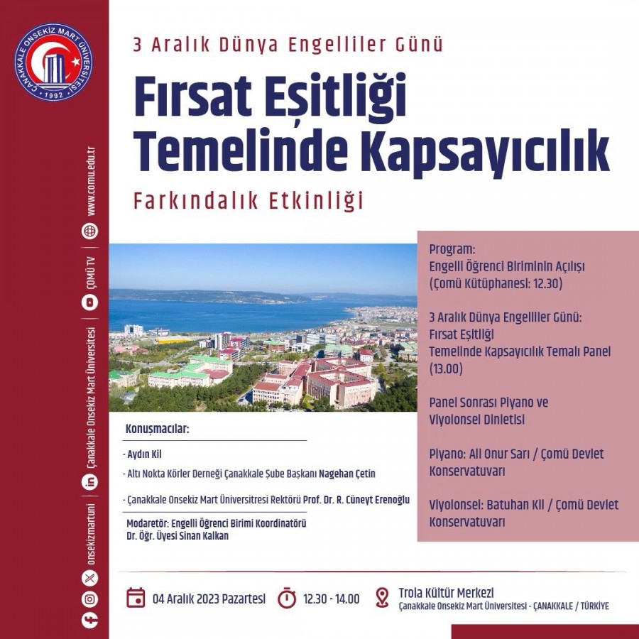 Within the scope of December 3 World Disability Day, you are invited to the "Inclusion Awareness on the Basis of Equal Opportunity" event to be held in partnership with the Department of Special Education and ÇOMU Disability Unit.