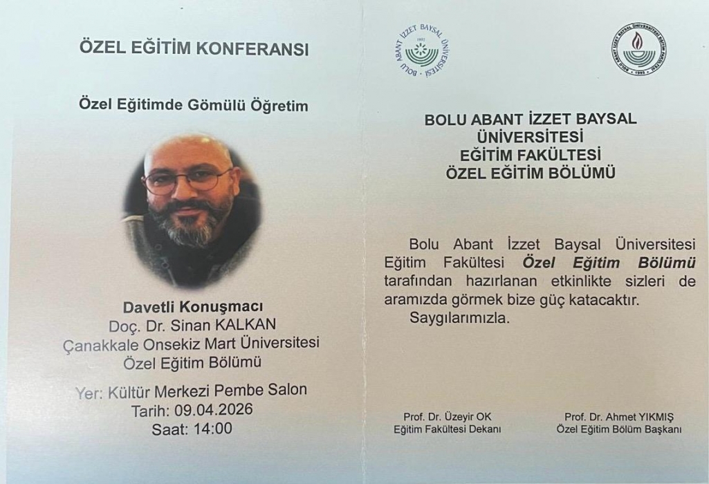 Assoc. Prof. Dr. Sinan KALKAN, from the Department of Special Education at Çanakkale Onsekiz Mart University, is cordially invited as a guest speaker to the event organized by the Bolu Abant İzzet Baysal University, Faculty of Education, Department of Special Education.